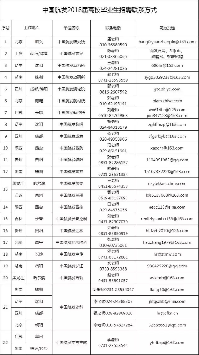 中國航發2018屆高校畢業生招聘聯系方式和簡歷投遞郵箱