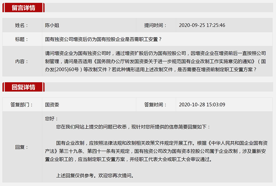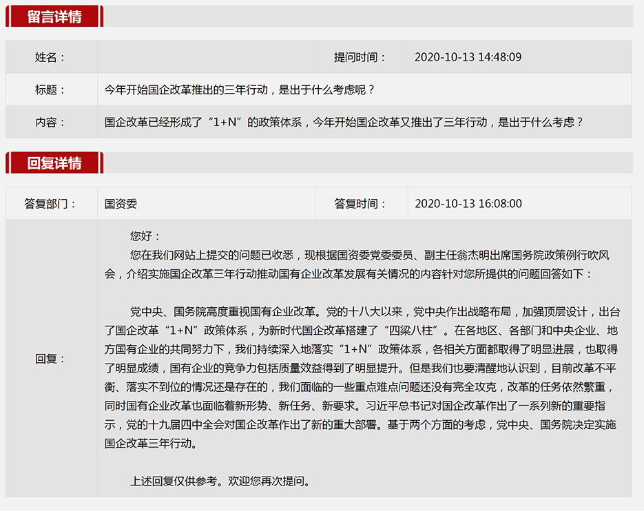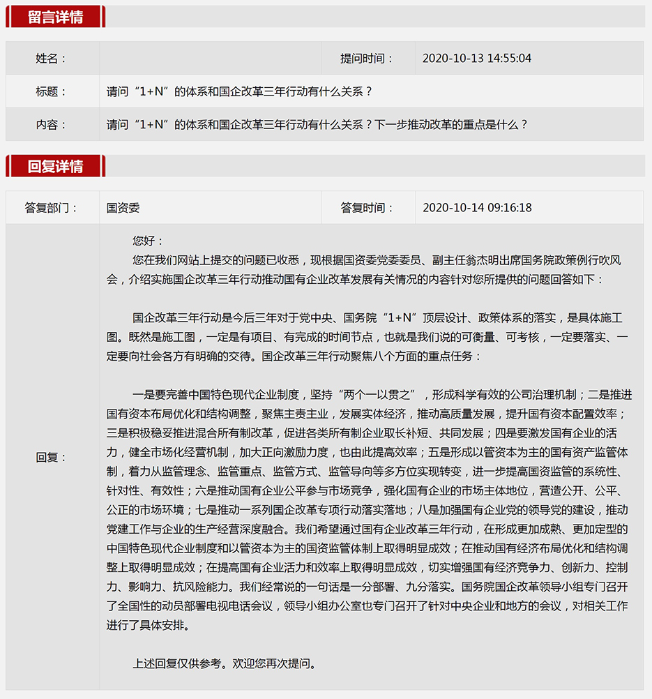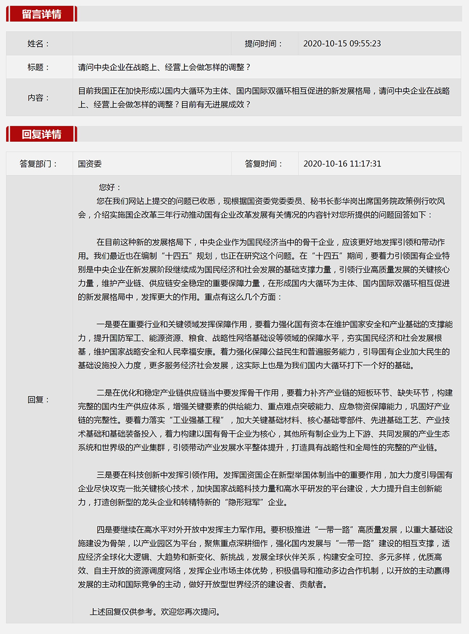 2020年10月國資委網站政務咨詢欄目部分網友提出的咨詢,我們初步做出了認真的回應,現選擇五條關注度高、點擊量高的問題,再次推薦分享。