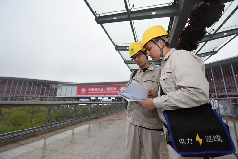 傅道峰正在與同事(shi)在進博會(hui)核心區(qu)域進行(xing)線路特(te)巡