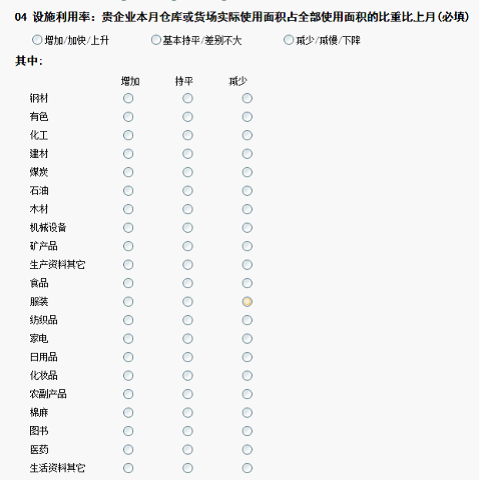 中(zhong)國(guo)倉(cang)儲指(zhi)數體系調查(cha)包含了生(sheng)產(chan)資料和消費品兩大類。調查(cha)的(de)(de)(de)地區將覆蓋(gai)全國(guo)(除港(gang)澳臺和新疆、西藏等)的(de)(de)(de)主要(yao)省市和地區。調查(cha)的(de)(de)(de)企業(ye)主要(yao)是為社會提供第三方(fang)倉(cang)儲及配套服務的(de)(de)(de)物流(liu)企業(ye)。主要(yao)是指(zhi)綜合性倉(cang)庫(ku)和專業(ye)性倉(cang)庫(ku)。不包括生(sheng)產(chan)企業(ye)的(de)(de)(de)自(zi)營倉(cang)庫(ku)和用戶的(de)(de)(de)自(zi)用倉(cang)庫(ku)。