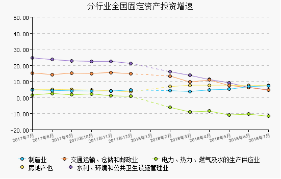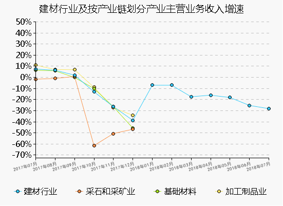 2018年7月規模以上工業增(zeng)加值(zhi)同比增(zeng)長(chang)6.00%,累計增(zeng)長(chang)增(zeng)長(chang)6.60%。 跟(gen)其他工業行(xing)業相比,建材行(xing)業增(zeng)加值(zhi)增(zeng)速低于設備制(zhi)造、電器機械和器材制(zhi)造、電力(li)、熱力(li)生產及供應等(deng)行(xing)業,高于化學原料(liao)和化學品制(zhi)造、黑色(se)金屬冶煉和壓(ya)(ya)延、有所金屬冶煉和壓(ya)(ya)延等(deng)行(xing)業。