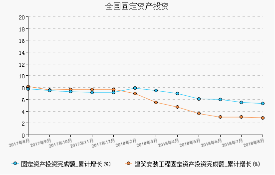 2018年8月全國固(gu)定(ding)資產投(tou)資累計增速增長5.3%,其(qi)中建筑(zhu)安裝工程投(tou)資累計增速增長2.9%。 圖 4:全國固(gu)定(ding)資產投(tou)資情況