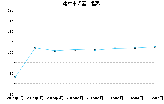 2018年8月,建材市場(chang)需(xu)求(qiu)指數為102.48,比(bi)(bi)上月增加0.58,比(bi)(bi)去年同月減少1.91。