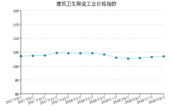 2018年(nian)8月,建(jian)筑(zhu)衛生陶(tao)瓷工(gong)業產品出廠(chang)(chang)價格(ge)(ge)指數為103.53,比(bi)上月上漲0.26%,比(bi)去年(nian)同月下(xia)降0.07%,一月至本(ben)月平(ping)均(jun)比(bi)去年(nian)同期(qi)上漲0.10%。 圖 1:建(jian)筑(zhu)衛生陶(tao)瓷工(gong)業產品出廠(chang)(chang)價格(ge)(ge)指數