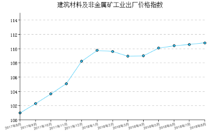 2018年8月(yue)(yue)(yue)(yue),建材價(jia)格指(zhi)數(shu)為110.83,比上月(yue)(yue)(yue)(yue)上漲(zhang)(zhang)(zhang)0.21%,比去年同月(yue)(yue)(yue)(yue)上漲(zhang)(zhang)(zhang)9.76%,一月(yue)(yue)(yue)(yue)至本月(yue)(yue)(yue)(yue)平均比去年同期上漲(zhang)(zhang)(zhang)11.15%。 價(jia)格指(zhi)數(shu)比上月(yue)(yue)(yue)(yue)上漲(zhang)(zhang)(zhang)的行業(ye)(ye)(ye)有(you):混(hun)凝土與水(shui)泥(ni)制品工(gong)業(ye)(ye)(ye)、防(fang)水(shui)建筑(zhu)材料(liao)工(gong)業(ye)(ye)(ye)、石灰石膏工(gong)業(ye)(ye)(ye)、建筑(zhu)用石工(gong)業(ye)(ye)(ye)、建筑(zhu)技術玻璃工(gong)業(ye)(ye)(ye)、;價(jia)格指(zhi)數(shu)比上月(yue)(yue)(yue)(yue)下(xia)降的行業(ye)(ye)(ye)有(you)水(shui)泥(ni)工(gong)業(ye)(ye)(ye)、墻體材料(liao)工(gong)業(ye)(ye)(ye)、輕質建筑(zhu)材料(liao)工(gong)業(ye)(ye)(ye)、隔熱保溫材料(liao)工(gong)業(ye)(ye)(ye)、粘土和(he)砂石開(kai)采工(gong)業(ye)(ye)(ye)。