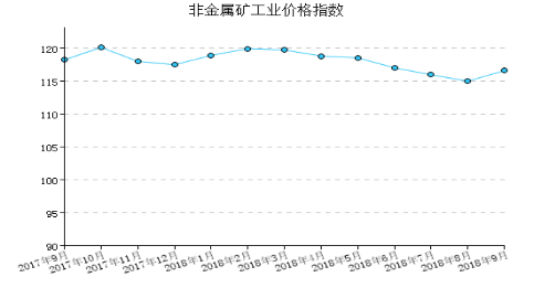 2018年(nian)9月(yue)(yue),非金屬(shu)礦工業產品出廠價(jia)格(ge)指數(shu)為116.63,比(bi)上(shang)月(yue)(yue)上(shang)漲1.39%,比(bi)去年(nian)同(tong)月(yue)(yue)下降1.39%,一月(yue)(yue)至本月(yue)(yue)平均比(bi)去年(nian)同(tong)期上(shang)漲11.05%。