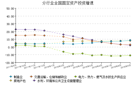 分行業來看:房地產業累計投資增速增長8個百分點;水利、環境和公共設施投資增速增長2個百分點;交通運輸、倉儲和郵政業投資增速增長3個百分點;制造業投資增速增長9個百分點。