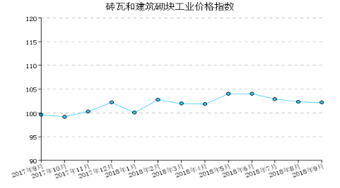 2018年9月(yue),磚瓦和建(jian)筑(zhu)砌(qi)塊工業(ye)產品出廠價格指數為102.17,比上(shang)月(yue)下降0.16%,比去(qu)年同(tong)月(yue)上(shang)漲2.60%,一月(yue)至本月(yue)平均(jun)比去(qu)年同(tong)期(qi)上(shang)漲2.72%。