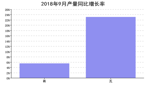 2018年9月(yue)規(gui)模以上工(gong)業(ye)(ye)增加值同比增長5.80%,累計增長增長6.40%。 跟其他(ta)工(gong)業(ye)(ye)行(xing)業(ye)(ye)相比,建材(cai)行(xing)業(ye)(ye)增加值增速低(di)于(yu)設備(bei)制(zhi)造(zao)、電器機械和器材(cai)制(zhi)造(zao)、電力、熱力生產及供應(ying)等行(xing)業(ye)(ye),高于(yu)化學(xue)原料(liao)和化學(xue)品制(zhi)造(zao)、黑(hei)色(se)金屬(shu)冶(ye)煉(lian)和壓延、有所(suo)金屬(shu)冶(ye)煉(lian)和壓延等行(xing)業(ye)(ye)。