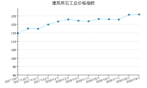 2018年9月,建筑(zhu)用石工業(ye)產品出廠價格指數為125.83,比(bi)上月上漲0.07%,比(bi)去年同(tong)月上漲9.74%,一月至本月平均(jun)比(bi)去年同(tong)期(qi)上漲10.04%。