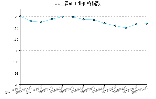 2018年10月(yue),非金屬礦(kuang)工業產品出廠價格(ge)指數為116.89,比(bi)上月(yue)上漲0.22%,比(bi)去年同(tong)月(yue)下降2.73%,一月(yue)至本月(yue)平均比(bi)去年同(tong)期上漲9.51%。