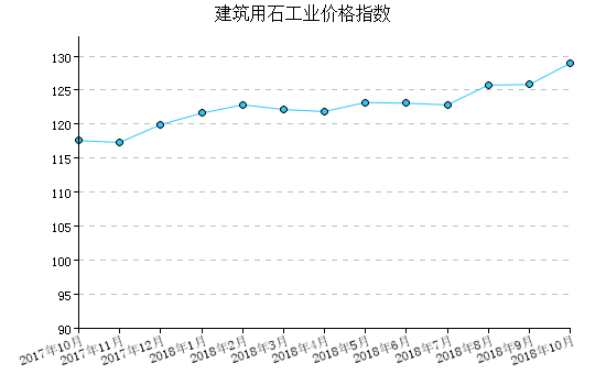 2018年10月(yue),建(jian)筑用石(shi)工(gong)業(ye)產品出廠價格指數為128.94,比上(shang)(shang)月(yue)上(shang)(shang)漲(zhang)(zhang)2.48%,比去(qu)年同(tong)月(yue)上(shang)(shang)漲(zhang)(zhang)9.66%,一月(yue)至本月(yue)平均比去(qu)年同(tong)期上(shang)(shang)漲(zhang)(zhang)10.00%。