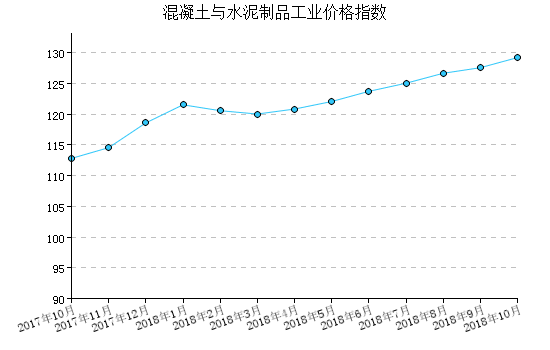 2018年(nian)10月(yue)(yue),混凝(ning)土與水泥制品工業產(chan)品出廠價(jia)格指數(shu)為(wei)129.20,比(bi)上月(yue)(yue)上漲1.29%,比(bi)去(qu)年(nian)同月(yue)(yue)上漲14.55%,一月(yue)(yue)至本月(yue)(yue)平均比(bi)去(qu)年(nian)同期(qi)上漲16.79%。