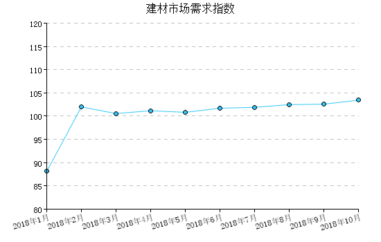 2018年10月,建材市場需(xu)求指數為103.43,比上(shang)月增(zeng)(zeng)加0.85,比去年同月增(zeng)(zeng)加0.99%。;