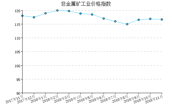 2018年(nian)11月,非(fei)金屬礦(kuang)工業(ye)產品出廠價格指(zhi)數為(wei)116.73,比(bi)上(shang)月下降0.14%,比(bi)去年(nian)同月下降1.12%,一月至本月平均(jun)比(bi)去年(nian)同期上(shang)漲8.46%。 圖 1:非(fei)金屬礦(kuang)工業(ye)產品出廠價格指(zhi)數