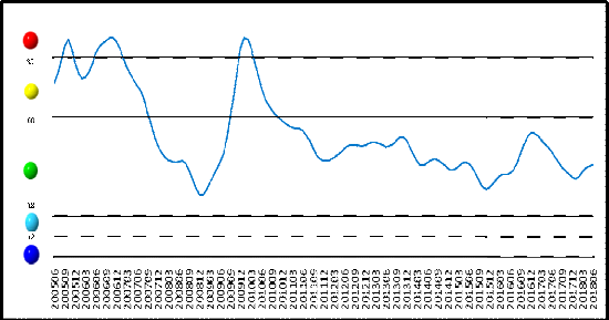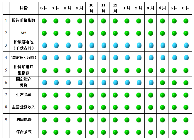 從中(zhong)色鉛鋅(xin)產(chan)業月度(du)景氣信號燈(deng)可(ke)見(見圖2),2018年6月,在構成中(zhong)色鉛鋅(xin)產(chan)業月度(du)景氣指數(shu)的9個(ge)指標中(zhong):鉛鋅(xin)價格指數(shu)、M2、鉛鋅(xin)礦(kuang)進口量、固定(ding)資(zi)產(chan)投(tou)資(zi)、生產(chan)指數(shu)、主營業務收入、利潤總額位于(yu)“正常(chang)”區(qu)間;鉛酸蓄電(dian)池、鍍鋅(xin)板位于(yu)“偏(pian)冷(leng)”區(qu)間。