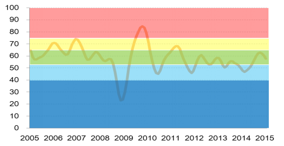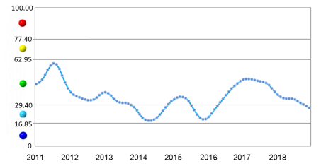中(zhong)色鋁(lv)冶煉產(chan)業(ye)景氣指數監測結果顯示,2018年(nian)12月(yue)份(fen),景氣指數為27.6,連(lian)續(xu)(xu)第(di)2個(ge)月(yue)位于(yu)“偏冷”區間,行(xing)業(ye)運行(xing)總體延續(xu)(xu)消費趨弱、價(jia)格低(di)迷、效益下(xia)(xia)滑、貿(mao)摩增多的(de)態勢。自2018年(nian)7月(yue)以(yi)來,先(xian)行(xing)合成指數已連(lian)續(xu)(xu)6個(ge)月(yue)呈現回(hui)落,12月(yue)份(fen)降至64.4,表明行(xing)業(ye)還存(cun)在繼續(xu)(xu)下(xia)(xia)行(xing)的(de)壓(ya)力和風險。近13個(ge)月(yue)中(zhong)色鋁(lv)冶煉產(chan)業(ye)景氣指數見表1。