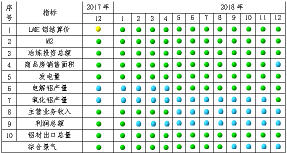 由中(zhong)色鋁(lv)冶煉(lian)(lian)產業景(jing)氣信號燈(見(jian)表2)可見(jian),2018年12月份(fen),在構成鋁(lv)冶煉(lian)(lian)產業景(jing)氣指數的10個(ge)指標中(zhong),商品房銷售面積、主營(ying)業務(wu)收入、利潤總(zong)(zong)(zong)額等3個(ge)指標處于“偏冷”區間(jian);LME鋁(lv)結(jie)算(suan)價、M2、鋁(lv)冶煉(lian)(lian)投資(zi)總(zong)(zong)(zong)額、發(fa)電量、氧(yang)化鋁(lv)產量、電解(jie)鋁(lv)產量、鋁(lv)材(cai)出口總(zong)(zong)(zong)量等7個(ge)指標處于“正(zheng)常”區間(jian)。