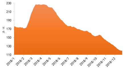 二是(shi)生產(chan)(chan)環比(bi)小幅(fu)增(zeng)長,庫存降(jiang)幅(fu)有(you)所(suo)收(shou)窄(zhai),國內鋁(lv)消費總體偏弱。經季(ji)調,2018年(nian)12月(yue)氧化(hua)鋁(lv)和(he)電(dian)解鋁(lv)日產(chan)(chan)量分別為(wei)19.7萬(wan)(wan)噸、9.2萬(wan)(wan)噸,環比(bi)分別增(zeng)長4.5%、3.1%。截止2018年(nian)12月(yue)底(di),鋁(lv)社(she)會庫存量為(wei)120萬(wan)(wan)噸,較(jiao)年(nian)初下降(jiang)了(le)56萬(wan)(wan)噸,其中12月(yue)份降(jiang)幅(fu)為(wei)10萬(wan)(wan)噸,環比(bi)收(shou)窄(zhai)35.7%。同時,以銷定產(chan)(chan)的鋁(lv)材產(chan)(chan)品月(yue)產(chan)(chan)量處于年(nian)底(di)低(di)位(wei),2018年(nian)11月(yue)降(jiang)至411萬(wan)(wan)噸,同比(bi)下降(jiang)22.4%。反(fan)映出國內鋁(lv)消費總體偏弱,主(zhu)要(yao)(yao)歸因于房地產(chan)(chan)及汽(qi)車兩大(da)主(zhu)要(yao)(yao)領域分別維(wei)持低(di)速增(zeng)長或已進入(ru)下行(xing)期。其中,汽(qi)車產(chan)(chan)銷雙降(jiang)已持續5個月(yue),11月(yue)份降(jiang)幅(fu)創新高(gao),同比(bi)分別下降(jiang)18.9%和(he)13.9%。2018年(nian)以來鋁(lv)社(she)會庫存變化(hua)見圖(tu)3。