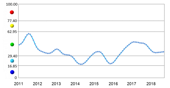 中色鋁(lv)冶煉(lian)產(chan)(chan)業(ye)月(yue)度景(jing)氣(qi)指(zhi)數(shu)(shu)顯示,2018年(nian)以來,景(jing)氣(qi)指(zhi)數(shu)(shu)始終(zhong)處(chu)于“正常”區間下部調整(zheng),繼二季度以來逐月(yue)回升,但漲幅有所(suo)收窄,9月(yue)份景(jing)氣(qi)指(zhi)數(shu)(shu)為35.1,環比(bi)回升0.1點。中色鋁(lv)冶煉(lian)產(chan)(chan)業(ye)月(yue)度景(jing)氣(qi)指(zhi)數(shu)(shu)走勢見圖1。