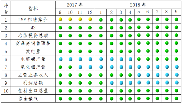 由中色鋁(lv)(lv)冶煉產(chan)(chan)業(ye)景氣信號燈(見表2)可見,2018年(nian)9月(yue)份,在(zai)構成鋁(lv)(lv)冶煉產(chan)(chan)業(ye)景氣指(zhi)(zhi)(zhi)數的10個指(zhi)(zhi)(zhi)標中,氧(yang)化鋁(lv)(lv)產(chan)(chan)量(liang)、主營業(ye)務收入、利潤總額(e)等(deng)3個指(zhi)(zhi)(zhi)標處(chu)于“偏冷(leng)”區(qu)間;LME鋁(lv)(lv)結算價、M2、鋁(lv)(lv)冶煉投(tou)資總額(e)、商品(pin)房銷售(shou)面積、發電(dian)量(liang)、電(dian)解鋁(lv)(lv)產(chan)(chan)量(liang)、鋁(lv)(lv)材出口總量(liang)等(deng)7個指(zhi)(zhi)(zhi)標處(chu)于“正常(chang)”區(qu)間。
