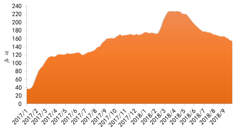 結合(he)供需,截止9月底(di),社(she)會(hui)鋁庫存量較3月底(di)歷(li)史高(gao)位227萬噸下(xia)降了72萬噸,但已在(zai)155萬噸上下(xia)維持(chi)了半月有余,仍(reng)未呈(cheng)現出明顯下(xia)降跡象(xiang)。近年來鋁社(she)會(hui)庫存量變化情況見圖(tu)4。