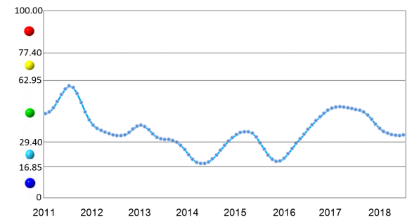 中(zhong)色(se)鋁冶(ye)(ye)煉產業月度景氣指數(shu)(shu)顯示(shi),2018年以來,景氣指數(shu)(shu)始(shi)終處于(yu)“正(zheng)常(chang)”區間(jian)下(xia)(xia)部調整,且前(qian)6個月逐月回落,7月份首次出現回升,景氣指數(shu)(shu)為33.5,環(huan)比回升0.3點,但(dan)仍(reng)位(wei)于(yu)正(zheng)常(chang)區間(jian)下(xia)(xia)沿。中(zhong)色(se)鋁冶(ye)(ye)煉產業月度景氣指數(shu)(shu)走(zou)勢見(jian)圖1。