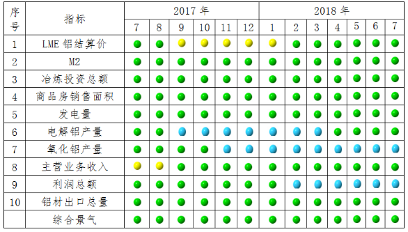 由中色(se)鋁(lv)(lv)(lv)(lv)冶(ye)煉產業景(jing)氣(qi)信(xin)號燈(見(jian)(jian)圖2)可見(jian)(jian),2018年7月,在構成鋁(lv)(lv)(lv)(lv)冶(ye)煉產業景(jing)氣(qi)指數的10個指標中,LME鋁(lv)(lv)(lv)(lv)結算價、M2、鋁(lv)(lv)(lv)(lv)冶(ye)煉投資總(zong)額、商(shang)品房銷售(shou)面(mian)積、發電(dian)(dian)量(liang)、電(dian)(dian)解鋁(lv)(lv)(lv)(lv)產量(liang)、主營(ying)業務收入和鋁(lv)(lv)(lv)(lv)材出口總(zong)量(liang)等8個指標處于“正常”區間;氧化鋁(lv)(lv)(lv)(lv)產量(liang)和利潤總(zong)額等2個指標處于“偏冷”區間。