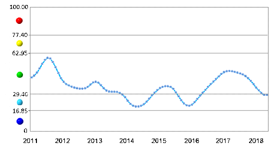 中色(se)(se)鋁冶(ye)煉(lian)(lian)產業(ye)月度(du)景(jing)(jing)氣指(zhi)數(shu)顯示,2018年以來,景(jing)(jing)氣指(zhi)數(shu)由“正(zheng)常(chang)”區間(jian)中部逐月回落至“偏冷”上沿。5月份景(jing)(jing)氣指(zhi)數(shu)為29.2,比上月回升0.1點(dian),是繼連續13個月下降(jiang)后的(de)首次回升,但仍位(wei)于偏冷狀態。中色(se)(se)鋁冶(ye)煉(lian)(lian)產業(ye)月度(du)景(jing)(jing)氣指(zhi)數(shu)走勢見圖1。