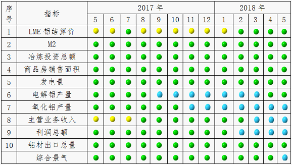 由中(zhong)色鋁(lv)(lv)(lv)冶煉產(chan)業(ye)景(jing)氣信(xin)號燈(見圖2)可見,2018年5月,在(zai)構成鋁(lv)(lv)(lv)冶煉產(chan)業(ye)景(jing)氣指(zhi)數的10個指(zhi)標(biao)(biao)(biao)中(zhong),LME鋁(lv)(lv)(lv)結算價、M2、鋁(lv)(lv)(lv)冶煉投資總額(e)、商品房銷售面積、發電(dian)量、電(dian)解鋁(lv)(lv)(lv)產(chan)量和(he)鋁(lv)(lv)(lv)材出口總量等7個指(zhi)標(biao)(biao)(biao)處(chu)于(yu)“正常”區間(jian);氧(yang)化鋁(lv)(lv)(lv)產(chan)量、主營業(ye)務收入(ru)和(he)利(li)潤總額(e)等3個指(zhi)標(biao)(biao)(biao)處(chu)于(yu)“偏(pian)冷(leng)”區間(jian)。