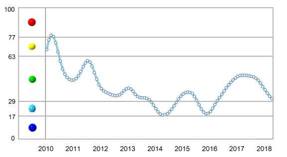 中色鋁(lv)冶(ye)煉產(chan)(chan)業月度景氣(qi)(qi)指數顯示,2018年以來(lai)景氣(qi)(qi)指數逐月回(hui)落,4月份降至(zhi)30.7,環比下降1.8點,接近“正常(chang)”區間(jian)下沿,但降幅持續收窄。表明行業處于低(di)位調(diao)整。中色鋁(lv)冶(ye)煉產(chan)(chan)業月度景氣(qi)(qi)指數走勢見圖1。