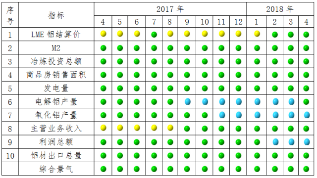 由(you)中色鋁冶煉產(chan)(chan)(chan)業景氣信號燈(見(jian)圖2)可見(jian),2018年3月,在構成鋁冶煉產(chan)(chan)(chan)業景氣指數的10個(ge)指標中,LME鋁結算價、M2、鋁冶煉投(tou)資總額、商品(pin)房銷售面積(ji)、發(fa)電(dian)(dian)量(liang)、電(dian)(dian)解(jie)鋁產(chan)(chan)(chan)量(liang)、主營(ying)業務收(shou)入和鋁材出口總量(liang)等8個(ge)指標處于“正常”區間(jian)(jian);氧(yang)化鋁產(chan)(chan)(chan)量(liang)和利潤總額處于“偏(pian)冷”區間(jian)(jian)。其中,電(dian)(dian)解(jie)鋁產(chan)(chan)(chan)量(liang)在連續7個(ge)月維持在“偏(pian)冷”后(hou)首次進入“正常”區間(jian)(jian),說明供暖季錯峰(feng)生產(chan)(chan)(chan)復產(chan)(chan)(chan)及新項(xiang)目投(tou)產(chan)(chan)(chan)效(xiao)果正逐步顯(xian)現(xian),生產(chan)(chan)(chan)有所回升。