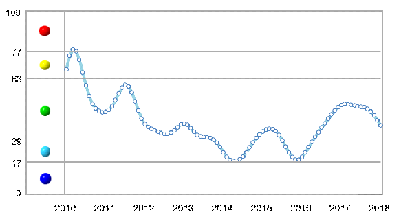 中(zhong)色(se)鋁(lv)(lv)冶煉(lian)產業月度(du)景(jing)(jing)(jing)氣(qi)指(zhi)數顯(xian)示,2018年初(chu),景(jing)(jing)(jing)氣(qi)指(zhi)數位于“正(zheng)常”區間,且繼(ji)續(xu)呈逐(zhu)月下降(jiang)態勢,1月份景(jing)(jing)(jing)氣(qi)指(zhi)數降(jiang)至37.6,環(huan)比降(jiang)幅為2.8點,表明(ming)行業運行動力仍顯(xian)不足。中(zhong)色(se)鋁(lv)(lv)冶煉(lian)產業月度(du)景(jing)(jing)(jing)氣(qi)指(zhi)數走勢見圖(tu)1。
