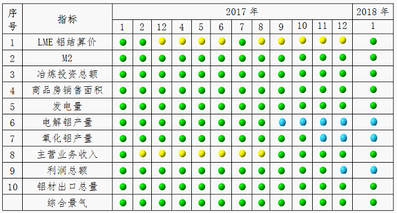 由中(zhong)色鋁(lv)冶煉產業景(jing)氣信號(hao)燈(見圖2)可見,2018年1月,在構成鋁(lv)冶煉產業景(jing)氣指數的10個指標(biao)(biao)中(zhong),LME鋁(lv)結算價、M2、鋁(lv)冶煉投(tou)資總額、發電量(liang)、主營業務(wu)收入、商品房銷售面積和鋁(lv)材(cai)出口總量(liang)等(deng)7個指標(biao)(biao)繼續處于“正常(chang)”區間;電解鋁(lv)產量(liang)、氧化鋁(lv)產量(liang)和利潤總額等(deng)3個指標(biao)(biao)處于“偏冷”區間。