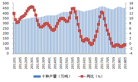 經季節調整,2018年5月份十種有色金屬生產指數為450.8萬噸,同比、環比分別回落0.6%和0.9%。各金屬品種生產整體運行平穩。精煉銅產量同比有所增長,原鋁產量有所回升,但增幅較小。精煉鉛、精煉鋅產量同比均有所增長。