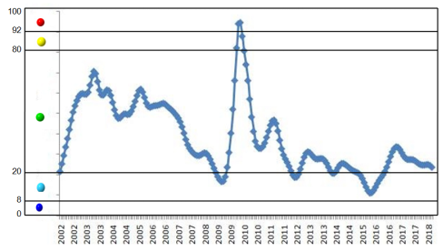 2018年8月,中經有色金屬產業景氣指數顯示為23.8,較上月回落1個百分點,在“正常”區域下部較平穩運行。