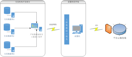 2.產權數據抽取及上(shang)報接口(kou)程序:接口(kou)程序由機(ji)構用(yong)戶自(zi)行開發(fa),此程序用(yong)于抽取上(shang)報數據,并(bing)將數據按(an)指(zhi)定格式發(fa)送給(gei)前置機(ji)接口(kou)端;