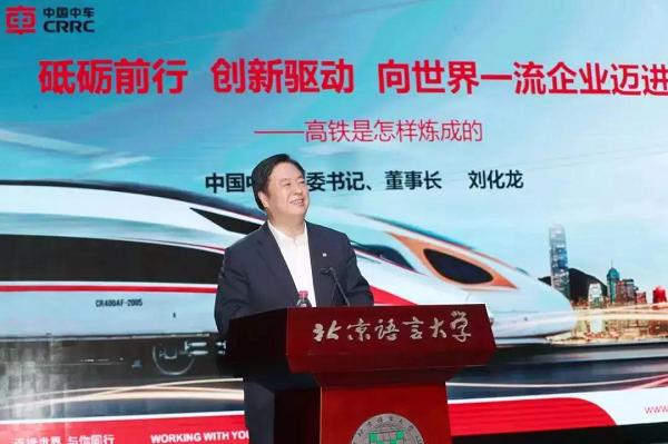 5月29日(ri),中(zhong)國(guo)中(zhong)車(che)集團(tuan)有限(xian)公司走進有“小聯合國(guo)”之(zhi)稱(cheng)的(de)(de)北京語言大(da)(da)學(xue),與該校聯合舉(ju)辦“領(ling)導干部上(shang)講臺”國(guo)企公開課北京語言大(da)(da)學(xue)專(zhuan)場報(bao)告會。中(zhong)國(guo)中(zhong)車(che)集團(tuan)黨委(wei)書(shu)記(ji)、董(dong)事長劉化龍(long)作了題為“砥礪前行 創新驅動(dong)(dong) 向世界一流企業邁進”的(de)(de)專(zhuan)場報(bao)告。語言大(da)(da)學(xue)師生(sheng)代表共計800多人參加活動(dong)(dong)。