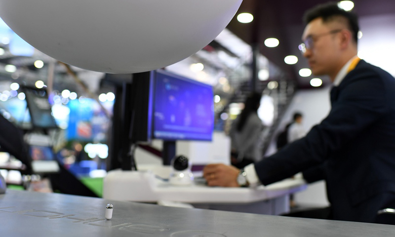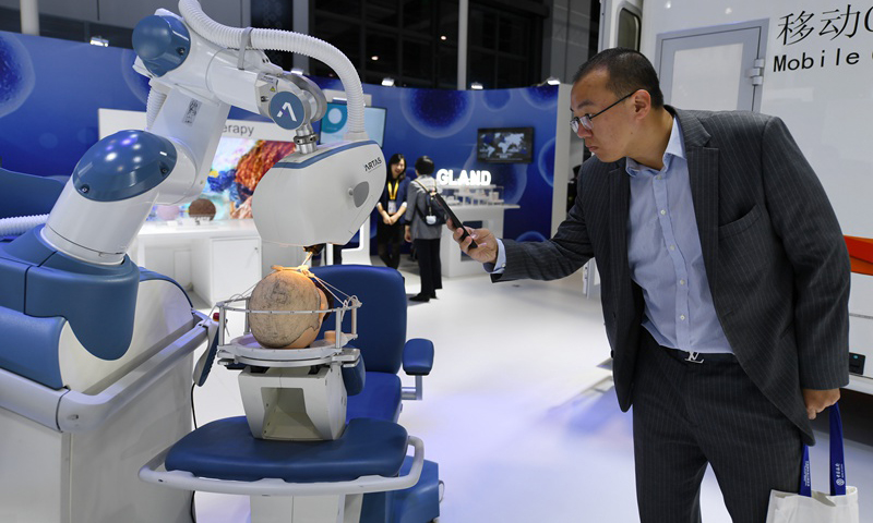 11月4日,在第(di)二屆進博(bo)會上(shang),觀眾對植發(fa)機器人產生(sheng)濃厚興(xing)趣。(人民(min)網記者 翁奇羽 攝)