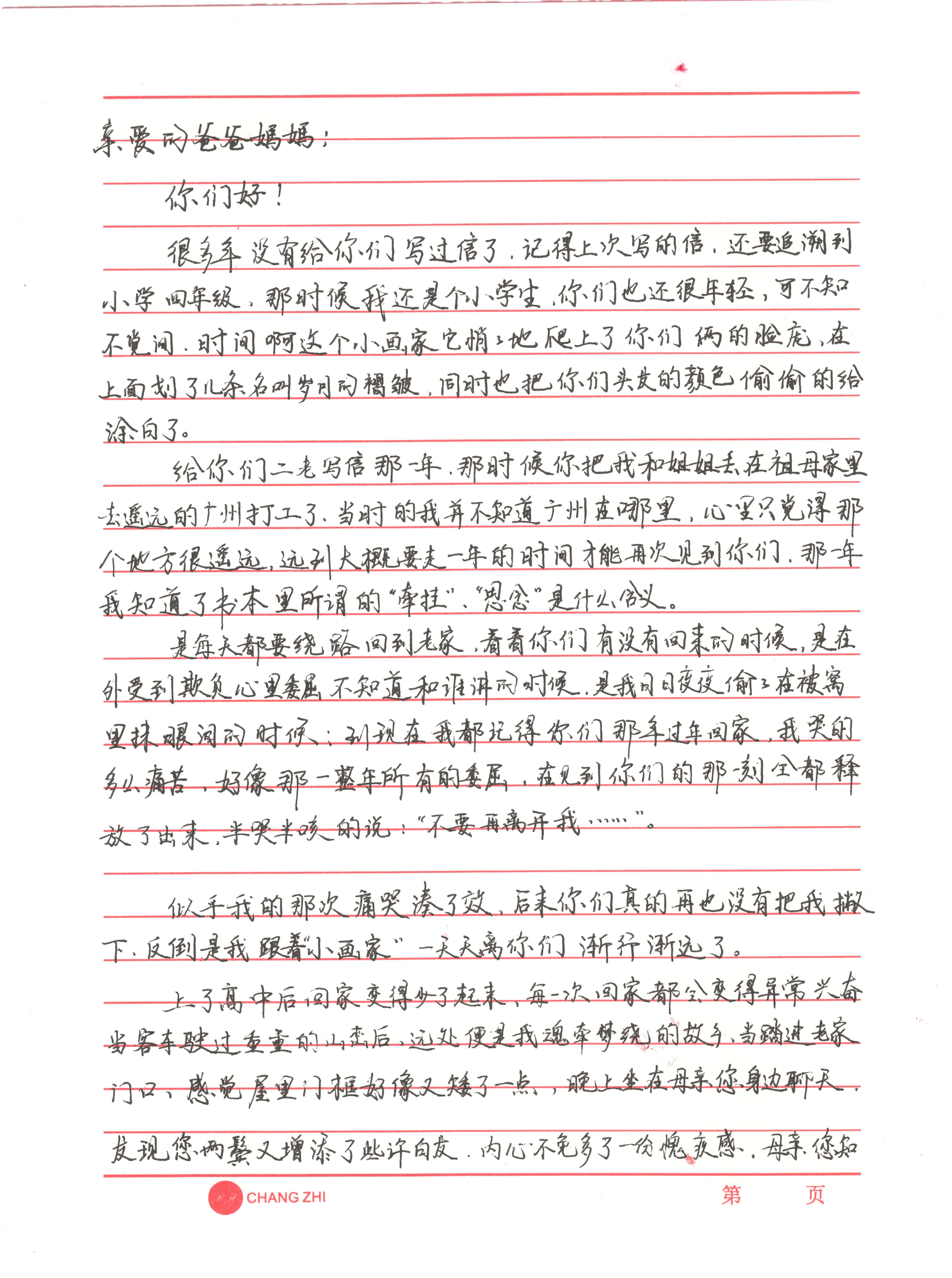 給你們二老寫信的那一年,那時候你們把我和姐姐丟在祖母家里,去遙遠的廣州打工了,當時的我并不知道廣州在哪里,心里只覺得那個地方很遙遠,遠到大概要走一年的時間才能再次見到你們,那一年我知道了書本里所謂的“牽掛”“思念”的真正含義。是每天都要繞路回到老家,看看你們有沒有回來的時候;是在外受到欺負心里委屈不知道和誰傾訴的時候;是我日日夜夜偷偷在被窩里抹淚的時候;到現在我都記得你們那年過年回家,我哭的有多么痛苦,好像那一整年所有的委屈,在見到你們的那一刻全都釋放了出來,半哭半咳地說:“不要再離開我…”。