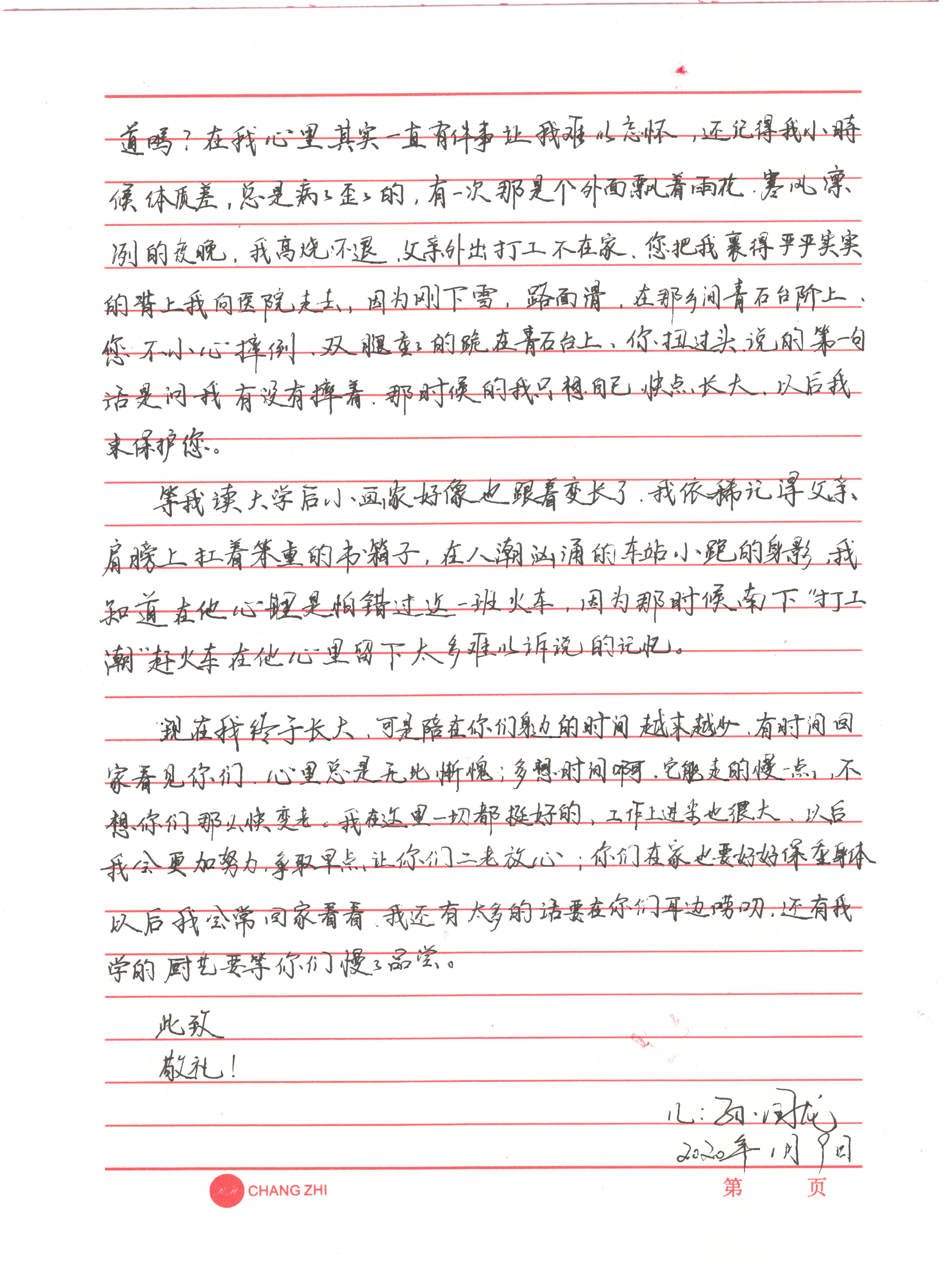 很多年沒有給你們寫過信了,記得上次寫的信,還要追溯到小學四年級,那時候我還是個小學生,你們也還很年輕,可不知不覺間,時間啊這個小畫家它悄悄地爬上了你們倆的臉龐,在上面劃了幾條名叫歲月的褶皺,同時也把你們頭發的顏色偷偷地給涂白了。