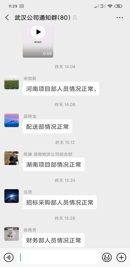 中國(guo)水利電(dian)力物資(zi)武(wu)(wu)漢公(gong)司成立(li)了應對疫(yi)情(qing)工(gong)作(zuo)領導(dao)小(xiao)組和(he)(he)辦(ban)(ban)公(gong)室,層(ceng)層(ceng)落(luo)實(shi)責(ze)任,并于每天(tian)下(xia)午(wu)通過(guo)微信(xin)視頻形式開(kai)(kai)會討論當天(tian)防(fang)控(kong)工(gong)作(zuo)情(qing)況,全面(mian)落(luo)實(shi)疫(yi)情(qing)防(fang)控(kong)工(gong)作(zuo)。從(cong)1月22日(ri)開(kai)(kai)始,該公(gong)司嚴格控(kong)制(zhi)上下(xia)班(ban)人員數(shu)量(liang),實(shi)行除特殊崗(gang)位和(he)(he)值(zhi)班(ban)要求外(wai),職(zhi)工(gong)在家隔離(li)辦(ban)(ban)公(gong)措施(shi);積極聯系附近的醫療衛生部門,購買防(fang)護(hu)口罩、酒精和(he)(he)84消(xiao)毒液,對辦(ban)(ban)公(gong)區域進行了全面(mian)的消(xiao)毒處理,做好外(wai)來人員登記;重點關(guan)注(zhu)新冠肺(fei)炎密切接觸者以及從(cong)武(wu)(wu)漢離(li)開(kai)(kai)去往(wang)外(wai)地職(zhi)工(gong)情(qing)況,隨時掌握離(li)退休人員身體情(qing)況和(he)(he)位置,協調做好防(fang)疫(yi)措施(shi);加強節日(ri)電(dian)話值(zhi)班(ban),確保(bao)信(xin)息暢通,應急事項有(you)效處理;并通過(guo)企業(ye)微信(xin)工(gong)作(zuo)群(qun),組織大(da)家學習(xi)、了解最新政(zheng)策情(qing)況,加強對職(zhi)工(gong)的宣傳(chuan)和(he)(he)引(yin)導(dao),確保(bao)職(zhi)工(gong)隊伍穩定。
