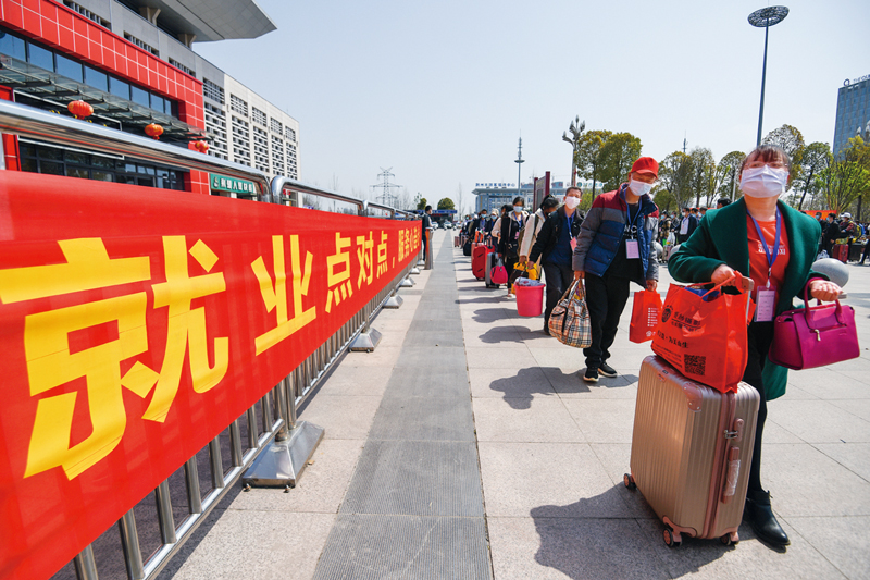 農民工是我國產業工人的主體。要建立健全農民工返崗務工溝通協調機制,加強輸出地和輸入地信息對接、運輸對接、健康檢測對接,暢通“點對點、一站式”復工服務通道,推動疫情防控期間務工人員安全有序返崗。圖為2020年3月19日,湖北省首批務工人員返崗就業專列從荊州火車站出發,外出務工人員正在進站乘車。 人民圖片 黃志剛/攝