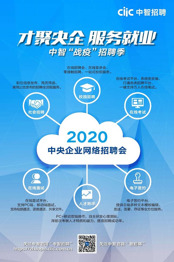 自新冠肺(fei)炎爆發(fa)以(yi)來,全面戰(zhan)疫(yi)已進(jin)入關鍵階段。疫(yi)情面前(qian),穩(wen)就(jiu)(jiu)業就(jiu)(jiu)是穩(wen)大(da)局,促(cu)進(jin)就(jiu)(jiu)業、維護穩(wen)定是中(zhong)央(yang)企業責無旁貸的(de)社會責任。為深入貫徹落(luo)實習近平(ping)總(zong)書(shu)記(ji)關于新冠肺(fei)炎疫(yi)情防控工(gong)作(zuo)的(de)重要指(zhi)示批示精神,認真落(luo)實黨中(zhong)央(yang)、國務(wu)院決策(ce)部署,國務(wu)院國資委在(zai)國務(wu)院聯防聯控機制新聞發(fa)布會上(shang)明確(que)提出采取靈活多樣的(de)招(zhao)(zhao)聘(pin)方(fang)式,積極(ji)穩(wen)妥推動人才招(zhao)(zhao)聘(pin)工(gong)作(zuo)的(de)要求,并于本月21日(ri)印發(fa)通知(zhi),鼓勵中(zhong)央(yang)企業與中(zhong)智集團合(he)作(zuo)開展網絡招(zhao)(zhao)聘(pin)工(gong)作(zuo)。