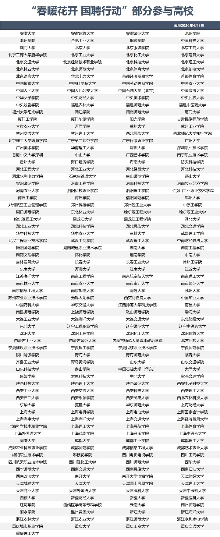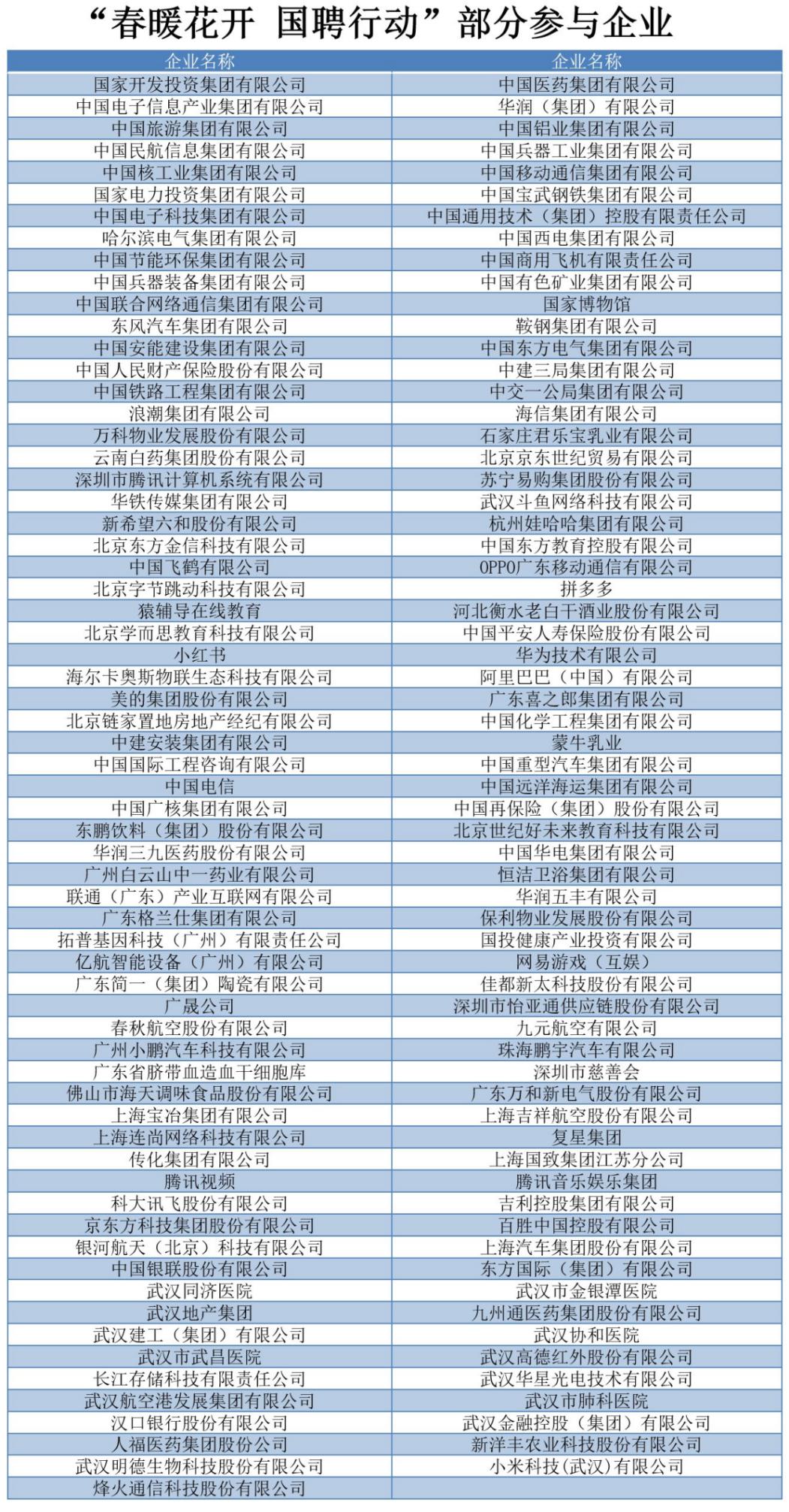 為助(zhu)力疫情(qing)期間企(qi)業復工復產(chan),有(you)效解決(jue)求職(zhi)(zhi)者燃眉之(zhi)急,中(zhong)(zhong)央(yang)廣播電視(shi)總(zong)臺央(yang)視(shi)頻(pin)在3月初啟動了“春暖花開 國(guo)聘行動”。目前,活動已經吸引4700多家(jia)各類(lei)企(qi)業和社會(hui)機(ji)構入(ru)駐。其中(zhong)(zhong),參(can)(can)與線上宣講的機(ji)構已達(da)130家(jia),中(zhong)(zhong)央(yang)企(qi)業和地方大(da)型國(guo)企(qi)占到近一半(ban),國(guo)內知名民營企(qi)業和大(da)型外資企(qi)業也悉(xi)數參(can)(can)與。活動提供的超(chao)過50萬個優質職(zhi)(zhi)位,受到廣大(da)應屆畢業生等求職(zhi)(zhi)者的歡迎。