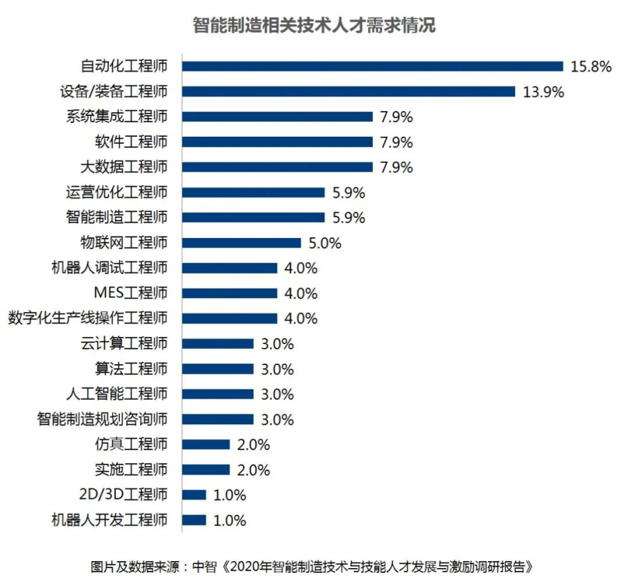 從企業招聘智能制(zhi)造(zao)(zao)相(xiang)關技(ji)(ji)術(shu)人(ren)才的(de)需(xu)求(qiu)來看,需(xu)求(qiu)量前三位依次是(shi)自(zi)動化類(lei)工(gong)(gong)程(cheng)(cheng)(cheng)(cheng)師(shi)、設備/裝備工(gong)(gong)程(cheng)(cheng)(cheng)(cheng)師(shi)、系統(tong)集(ji)成工(gong)(gong)程(cheng)(cheng)(cheng)(cheng)師(shi)、軟件工(gong)(gong)程(cheng)(cheng)(cheng)(cheng)師(shi)以及大數(shu)據(ju)工(gong)(gong)程(cheng)(cheng)(cheng)(cheng)師(shi),智能制(zhi)造(zao)(zao)技(ji)(ji)術(shu)人(ren)才的(de)需(xu)求(qiu)更多地集(ji)中在電氣(qi)與自(zi)動化、互(hu)聯網、人(ren)工(gong)(gong)智能等新興技(ji)(ji)術(shu)產(chan)業。