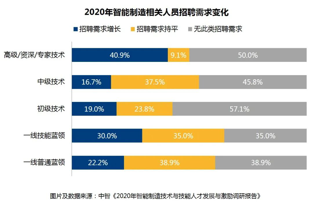 從(cong)企(qi)(qi)業(ye)2020年對(dui)智(zhi)(zhi)能(neng)制(zhi)(zhi)造相關技術(shu)和技能(neng)人員(yuan)的(de)招聘需求(qiu)來(lai)看(kan):高(gao)級/資深/專(zhuan)家技術(shu)人員(yuan)的(de)招聘需求(qiu)增長最多(duo),數據顯示40.9%企(qi)(qi)業(ye)會擴招此類崗位;對(dui)于初(chu)級技術(shu)人員(yuan)來(lai)說,有近六成(cheng)企(qi)(qi)業(ye)沒有此類人員(yuan)招聘需求(qiu),也(ye)就是說企(qi)(qi)業(ye)整體對(dui)初(chu)級技工人員(yuan)的(de)需求(qiu)偏(pian)低。此外,企(qi)(qi)業(ye)對(dui)于技能(neng)藍領的(de)招聘需求(qiu)大于一線(xian)普(pu)通藍領,三(san)成(cheng)企(qi)(qi)業(ye)表示針對(dui)技能(neng)藍領的(de)招聘需求(qiu)增加,反映了(le)在智(zhi)(zhi)能(neng)制(zhi)(zhi)造轉型趨勢(shi)下,企(qi)(qi)業(ye)對(dui)于一線(xian)藍領員(yuan)工技能(neng)要(yao)求(qiu)的(de)不(bu)斷提升(sheng)。