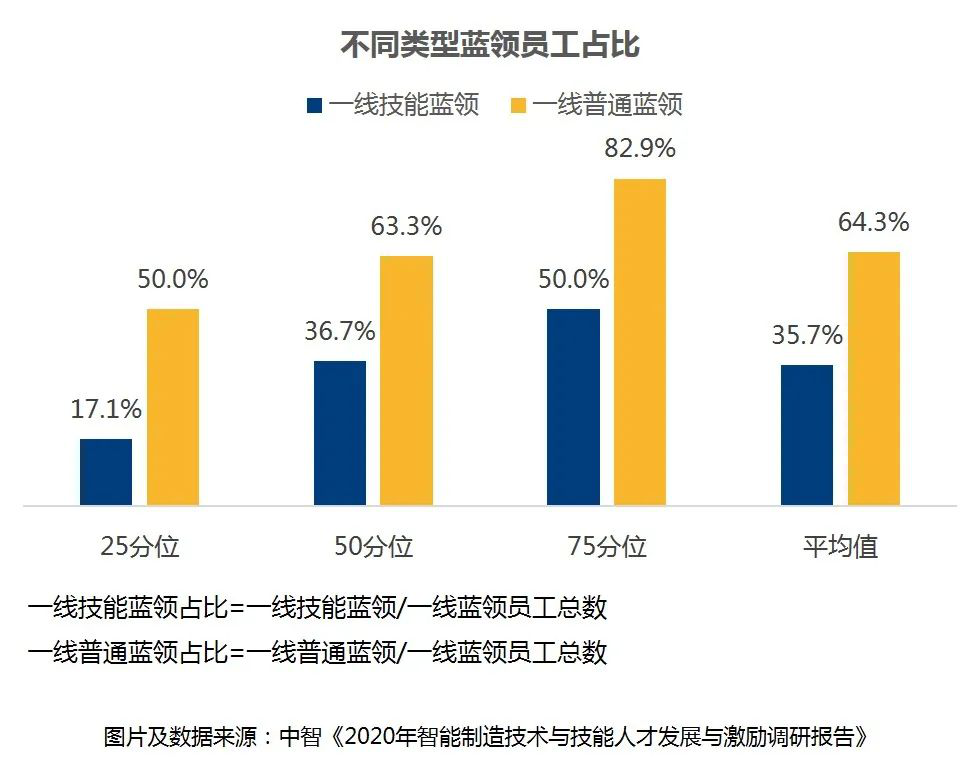 參與調研的(de)企業(ye)中,一(yi)線技能藍(lan)領占(zhan)藍(lan)領員(yuan)工(gong)的(de)比(bi)例(li)平均達到(dao)35.7%,一(yi)線普通(tong)(tong)藍(lan)領占(zhan)比(bi)平均為64.3%。預計隨著工(gong)業(ye)4.0以(yi)及智能化趨(qu)勢的(de)發展,企業(ye)對于技能人才的(de)需求(qiu)將進(jin)一(yi)步增(zeng)加(jia),而對普通(tong)(tong)操(cao)作工(gong)的(de)需求(qiu)將會減弱,一(yi)線技能藍(lan)領的(de)人員(yuan)配置比(bi)例(li)將進(jin)一(yi)步提升。
