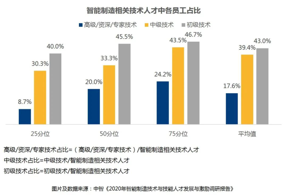 在(zai)智能制造(zao)相關技(ji)術(shu)人(ren)才中(zhong),高級(ji)/資深/專(zhuan)家技(ji)術(shu)人(ren)員占(zhan)比平均值(zhi)為17.6%,中(zhong)級(ji)技(ji)術(shu)人(ren)員占(zhan)比平均達到39.4%,初級(ji)技(ji)術(shu)人(ren)員占(zhan)比為43.0%,智能制造(zao)技(ji)術(shu)人(ren)才目前呈(cheng)現(xian)“金(jin)字塔(ta)”型分布趨(qu)勢。