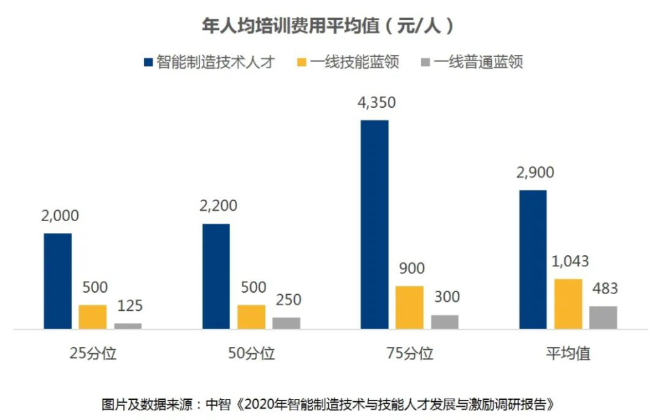 培(pei)訓(xun)成本方面,2020年(nian)(nian)(nian)(nian)一線普通(tong)藍領(ling)人(ren)(ren)(ren)均(jun)(jun)培(pei)訓(xun)費(fei)用(yong)平均(jun)(jun)值為(wei)483元(yuan)/年(nian)(nian)(nian)(nian),人(ren)(ren)(ren)均(jun)(jun)培(pei)訓(xun)時(shi)(shi)間(jian)為(wei)23小(xiao)(xiao)時(shi)(shi)/年(nian)(nian)(nian)(nian);2020年(nian)(nian)(nian)(nian)一線技能員工(gong)人(ren)(ren)(ren)均(jun)(jun)培(pei)訓(xun)費(fei)用(yong)為(wei)1043元(yuan)/年(nian)(nian)(nian)(nian),人(ren)(ren)(ren)均(jun)(jun)培(pei)訓(xun)時(shi)(shi)間(jian)為(wei)33小(xiao)(xiao)時(shi)(shi)/年(nian)(nian)(nian)(nian);2020年(nian)(nian)(nian)(nian)智能制造技術人(ren)(ren)(ren)才人(ren)(ren)(ren)均(jun)(jun)培(pei)訓(xun)費(fei)用(yong)為(wei)2900元(yuan)/年(nian)(nian)(nian)(nian),高位值可達4350元(yuan),人(ren)(ren)(ren)均(jun)(jun)培(pei)訓(xun)時(shi)(shi)間(jian)36小(xiao)(xiao)時(shi)(shi)/年(nian)(nian)(nian)(nian)。